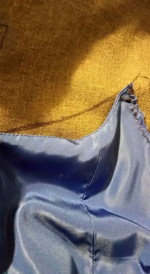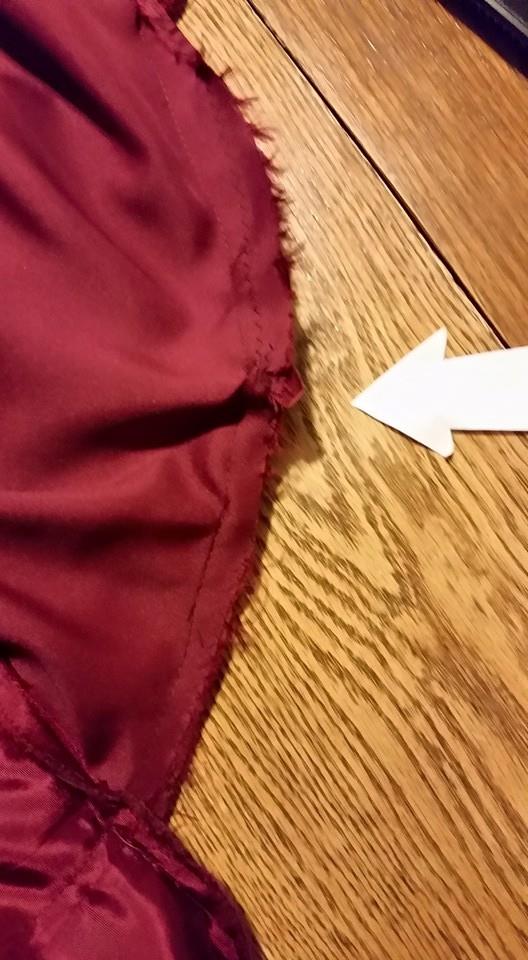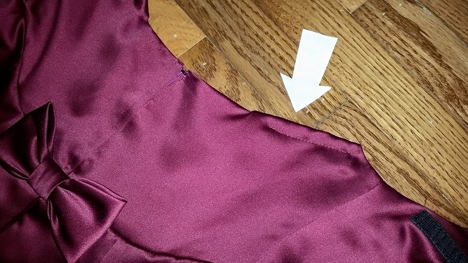 The first picture is from the inside–you can see they were cut off with just enough left to fold over and stitch down. In the second picture the arrow points to the back showing the stitching were they are sewn down. You can also see that the center back zipper is still in the cape–just being ignored and holding the thing together in the back. The bow was already a part of the dress.