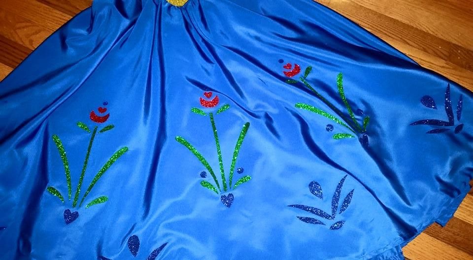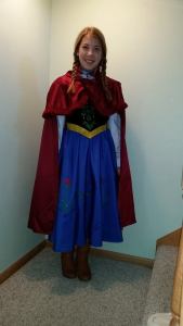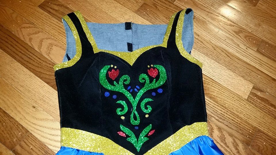 This post is about an “Anna” inspired costume I created last fall. I made this costume in about 8 hours over the course of two days. I was lucky enough to have the base dresses & trims in my “stash”. Most of the time came from cutting out and ironing on the dress “embroidery” designs.