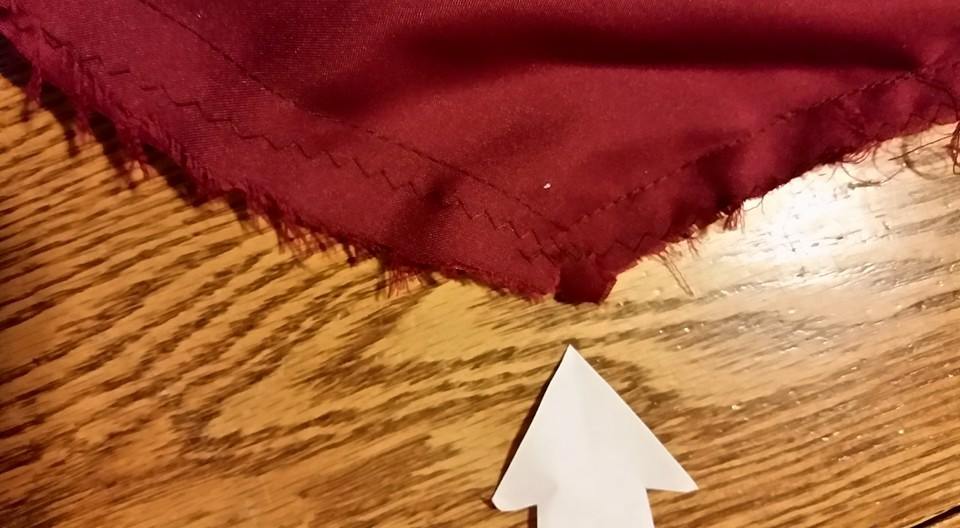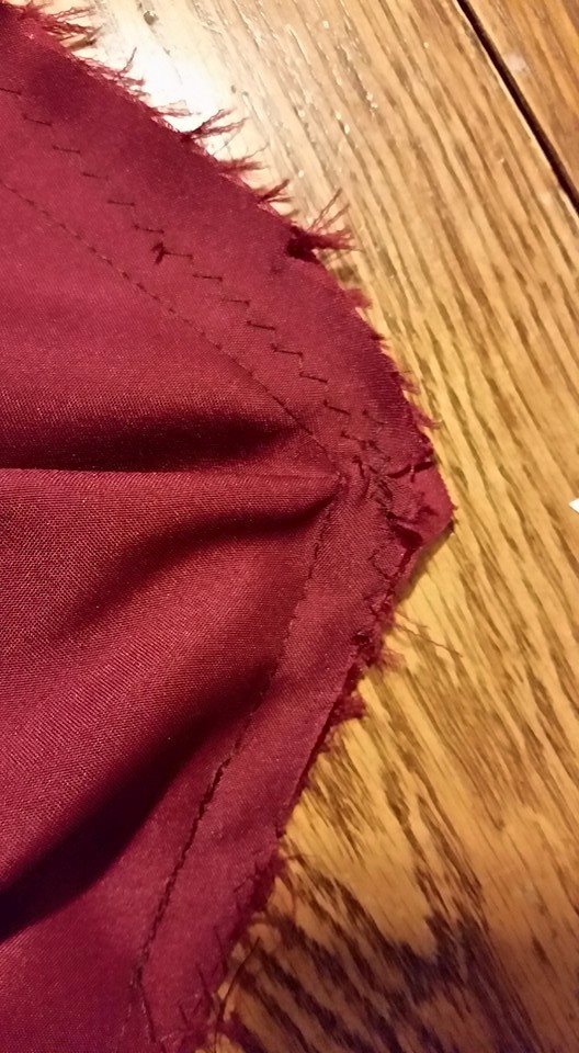 The front edge of the cape is still actually a straight line. The line now goes horizontal across the chest, makes a right turn, and then goes down the front edge of the cape. This does make the front bottom edge of the cape pull up and become a bit shorter than the back. The first picture shows the front edge pulled as straight as I can make it, the second shows how it wrinkles as it folds to make the corner, the third is flipped over and shows the opposite side, where you can see the right angle the stitching makes as the corner is turned. It is hard to see . .but I clipped the seam allowance to help the fabric make the turn.