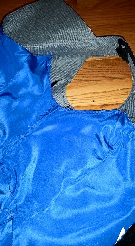 Next, I cut off the sleeves and zig-zagged the raw edges of the bodice front & lining together. This particular dress was one of those where the sleeve edge was elastic and made the shoulder strap . . so when I cut them off, there were no straps left on the dress.