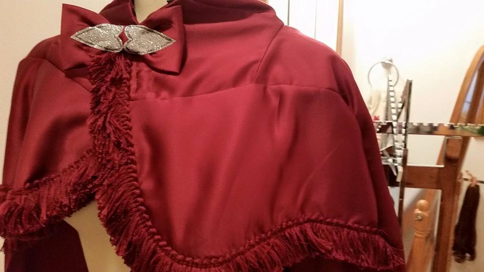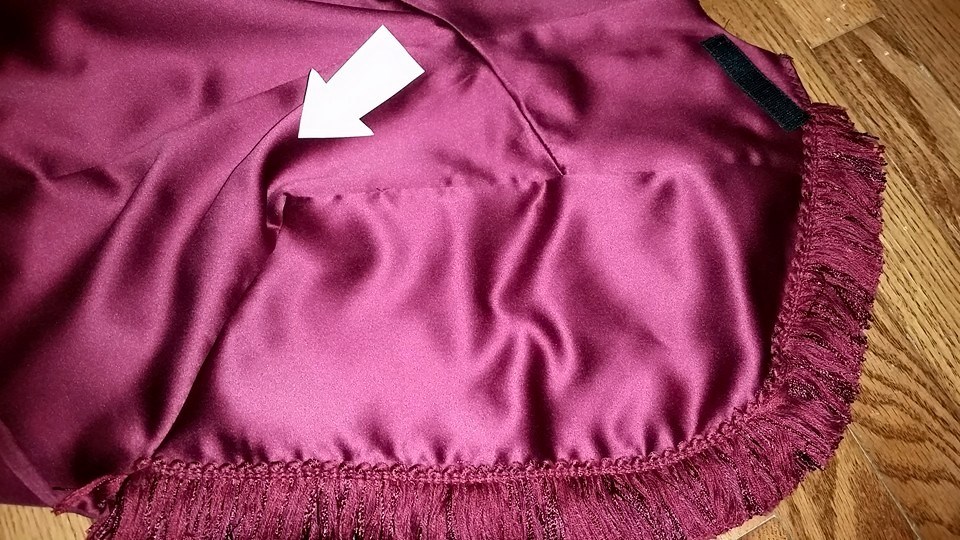 OK, I know this one is going to drive people crazy . . I will do my best to describe how this is done. My best advice is to not expect to duplicated it . . you can’t if you don’t have almost the exact same style dress. Just . . go with the flow, and use it as inspiration, and I will try to do a better step-by-step tutorial at some point. Basically, any burgundy dress or skirt can make an acceptable cape. (There are tons of ways to make dress & skirt capes . . those are for future posts 🙂 )