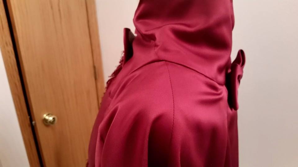 The next part of making a cape is the creative part . . somehow you want to make a “space” for the shoulders., If you have a dressmaker form, this can help. Looking at cape patterns or tutorials can also help. Basically you want to “listen” to the garment (I call this “fabric whispering”) and figure out how the original seams and lines of the garment want to go. If you try and “force” an upcycle . . it often won’t work. That is why I counsel that this may or may not work for you with a different base dress. You can also use gathers, pleats, elastic, a drawstring or a ribbon tie, or even make a totally separate “capelet” from other fabric.