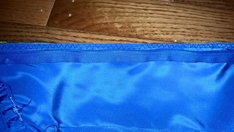 Next I needed to sew the bodice on to the dress. I didn’t have a dress form at that time, so I made my daughter put the blue dress on, and then the bodice, lined them up at the waist, and pinned them together. I then marked the inside where they needed to line up. I attached the bodice only in a few places–this sort of lets it “float” on top of the dress and I didn’t have to worry so much about pulling & bubbling.
