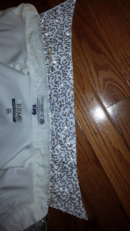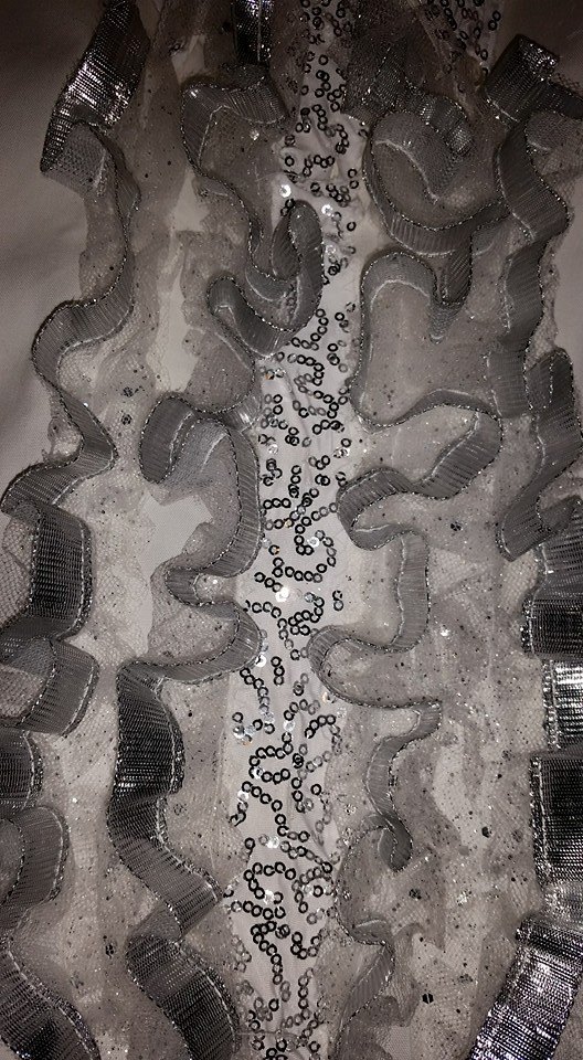 The silver sequin ribbon I had left over from another project. This ribbon is readily available in chain craft stores. It is super easy to sew on, looks good on-stage, and washes well.