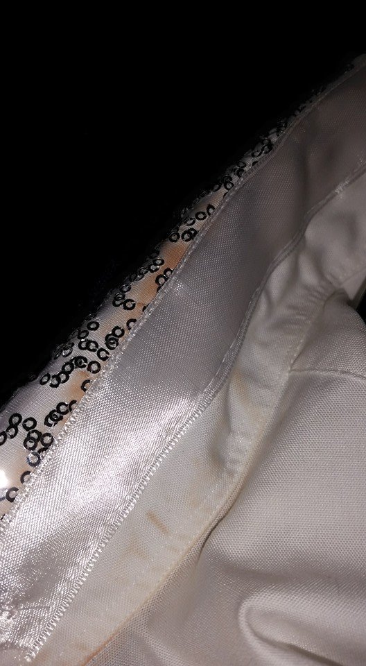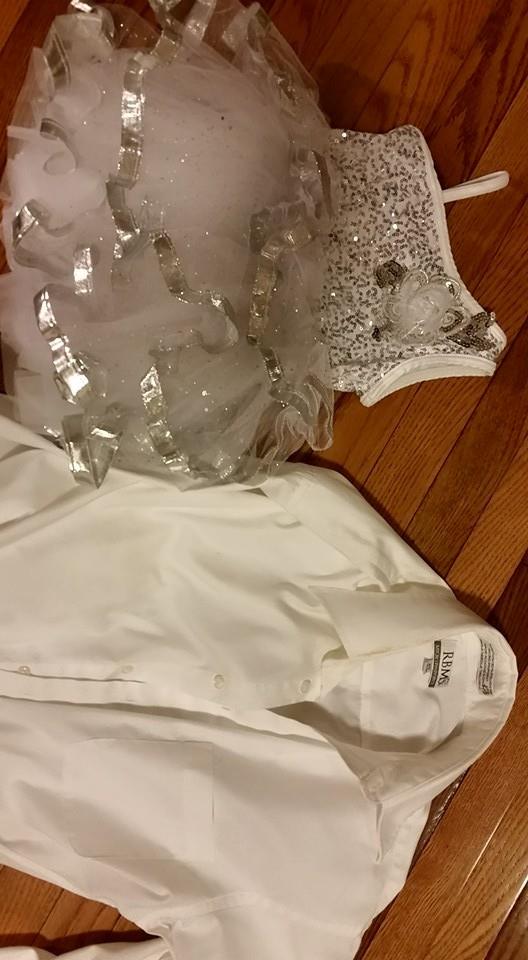 I then found a white & silver dance dress I had purchased from a local consignment store in the Halloween clearance, and purchased a white shirt and black pants at a local church thrift store.