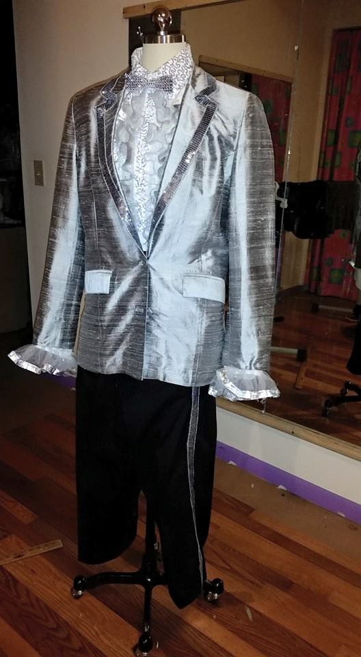 I decided early on not to go with pink–that just isn’t a color that is easily found in guy styled clothes . .but . . I did want to incorporate some of the components–ruffled shirt, tux style jacket, and a “style”.