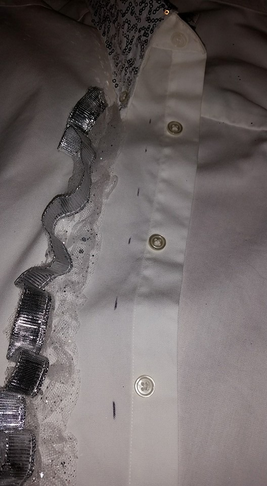 Next came the shirt. I wanted to make a ruffle tux shirt. The skirt of the tutu is made with glitter tulle. As I have mentioned before, I try to avoid using glitter fabrics because of the shedding factor (the custodians HATE it, and some auditoriums have glitter-free clauses in their rental contracts). This particular dress had been well-loved, plus I had washed it, so the “shedding” factor was almost non-existent at this point.