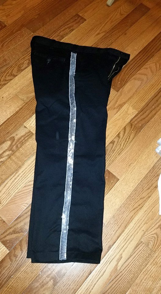 The last thing I did was to hem the pants, and sew sequin ribbon down the sides. I did have to sew first down from the top, and then up from the bottom of the leg to get it done without opening up the pant seams.