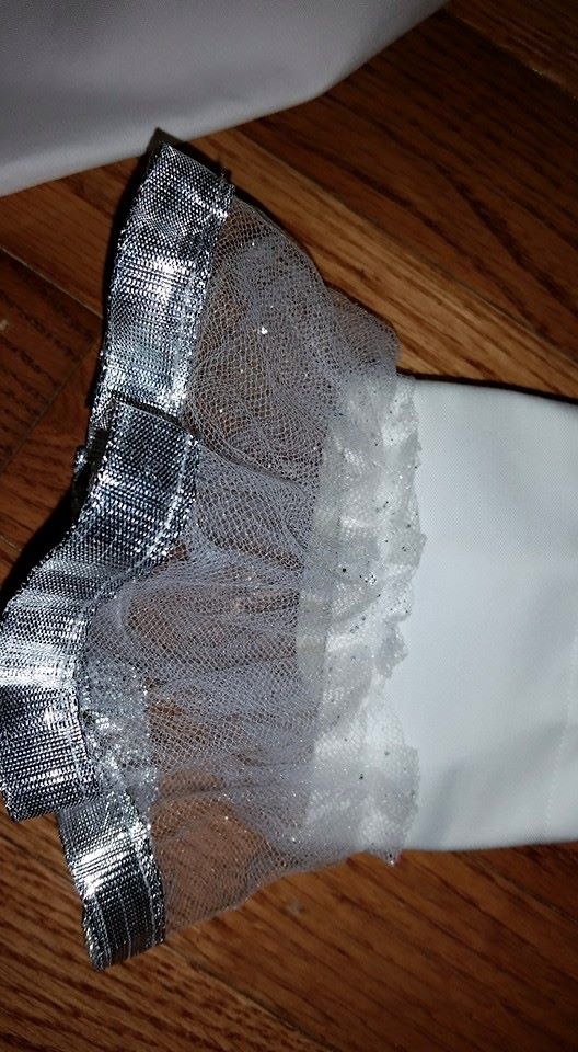 Next, I added a row of ruffles to the cuff. Again, I just squished the tulle together as I sewed to gather it, and then heat sealed the silver ribbon.