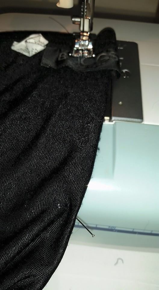 This picture shows sewing across the back pleats. I am using a large zig zag stitch since this neckline will be fairly stretchy, both because of the elastic and the stretch fabric. Remember to back-stitch whenever you start and stop.
