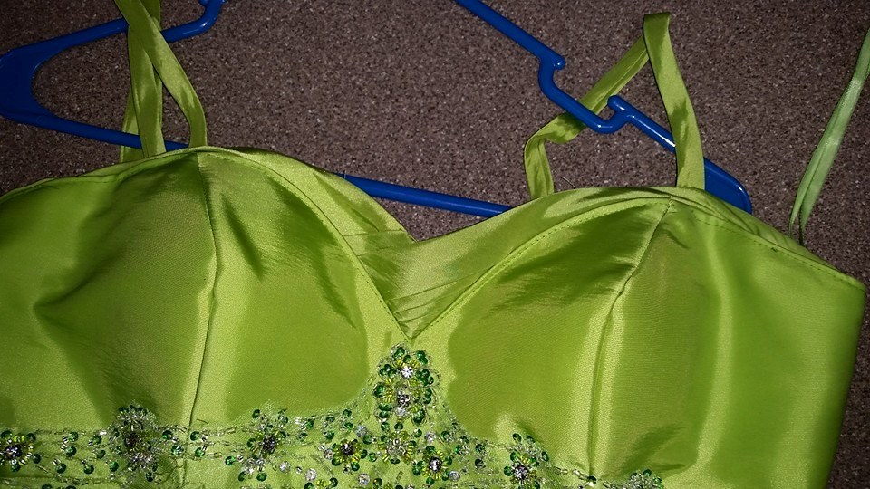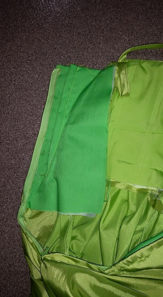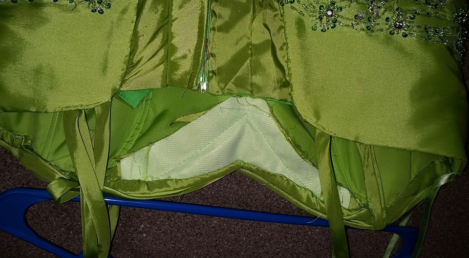 This is actually a dress that I found altered this way in a Thrift shop. You can see the original top is a lace & sequin fabric, and the inset is just green satin. I honestly bought the dress in large part for the visual of this alteration. I was pleasantly surprised at how little I was “bothered” by the non-matching material in the bodice. And truly, onstage, the back of a garment is seen a relatively small amount of time, if at all. The second picture is the inside view. Note when this alteration was done, all of the excess fabric was trimmed out, leaving just the wedge-shaped pieces.