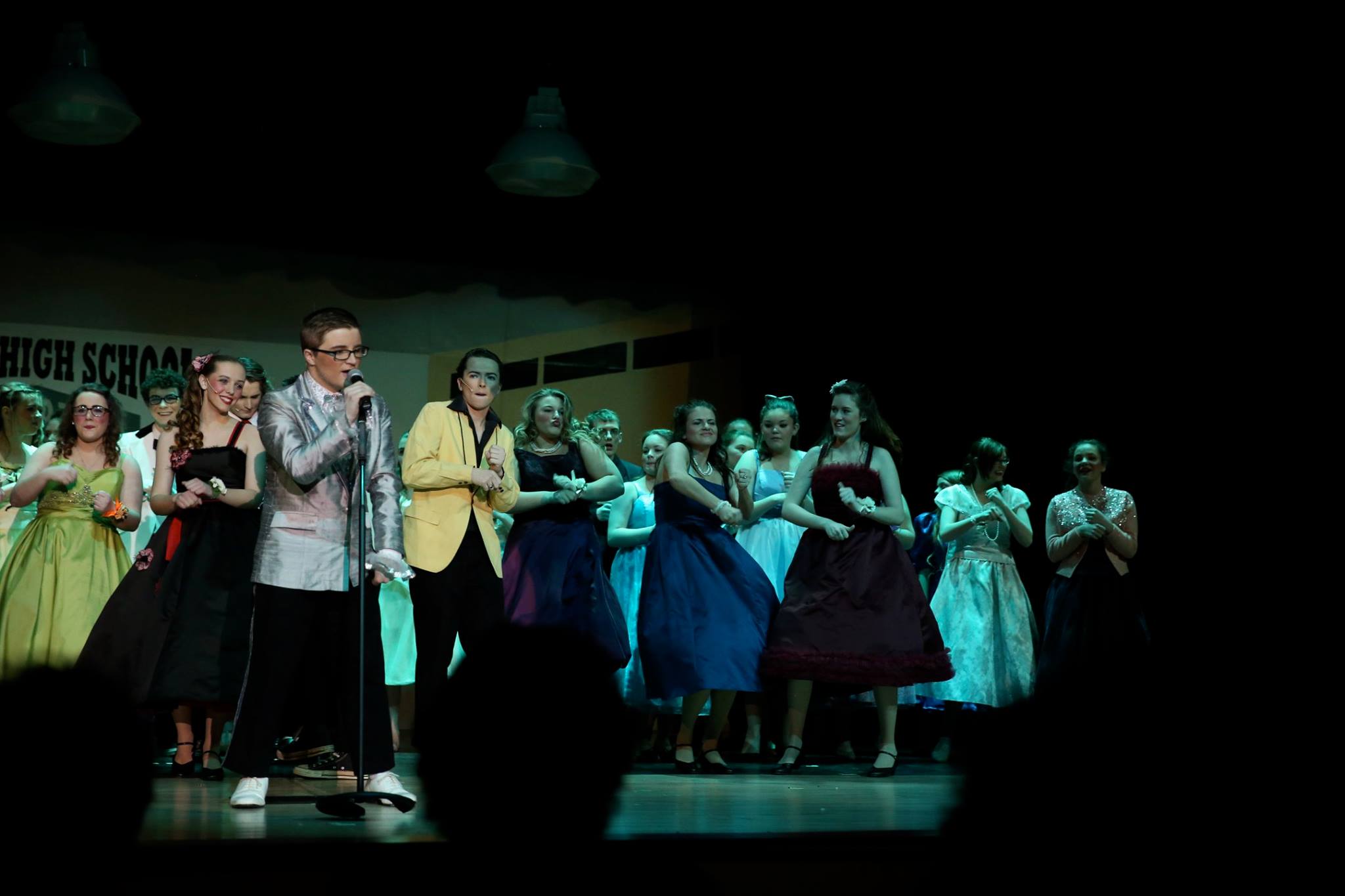 The finished dress front & back. A bow was added to the back to give it a 1950’s flair. The bow is sewn on one side, and attaches with hook & loop tape on the other. (The dress is looking a little limp, as it just came back from being washed. We wash all of our costumes on cold, delicate and hang dry. A little time with a steamer, and it would look less limp. Spray starch and an iron is also another good way to spiff costumes up when you’ve pulled them off the rack, if the fabric type allows)