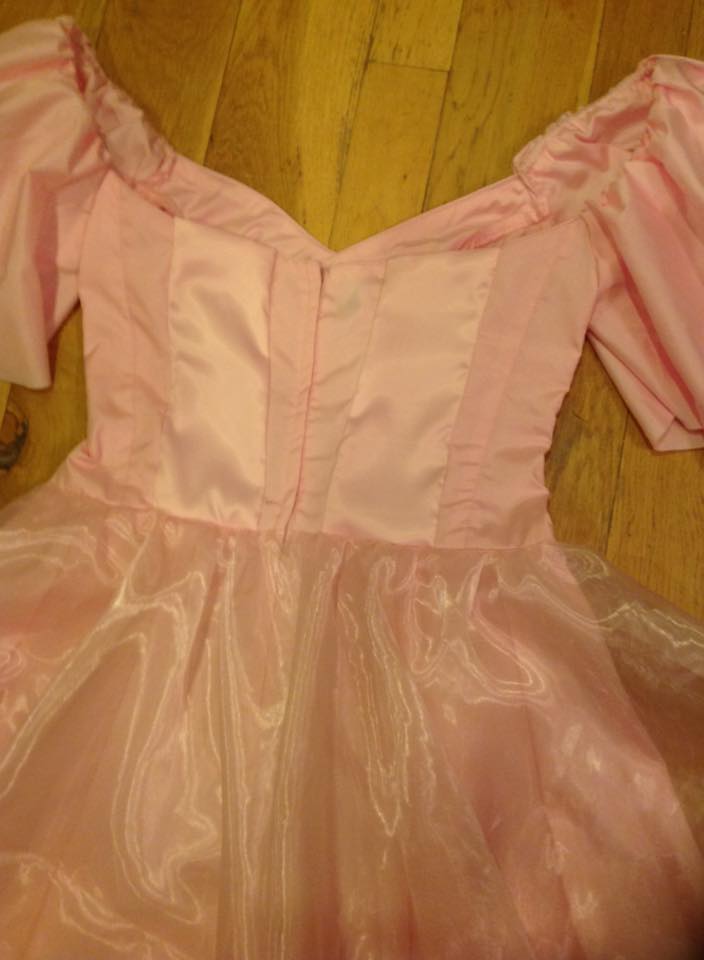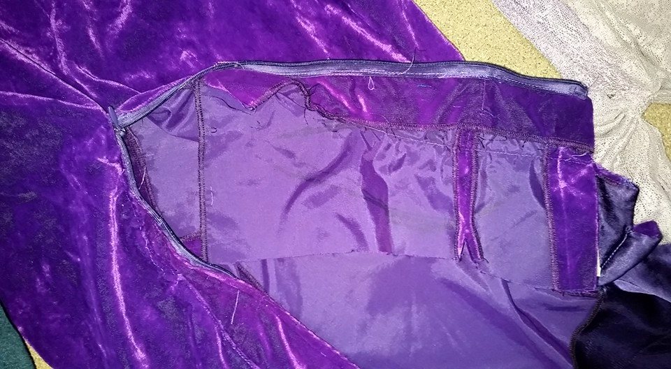 Addendum: This is a comment added by a volunteer who did a number of these dresses: “As a volunteer who used this method–the transition where the zipper goes from the added piece to the dress is tricky, takes some pinning. However, on stage that rough spot just doesn’t show. If there is time, finish one side by sewing the extra piece to the dress, then re-fit the costume and sew the second side”.