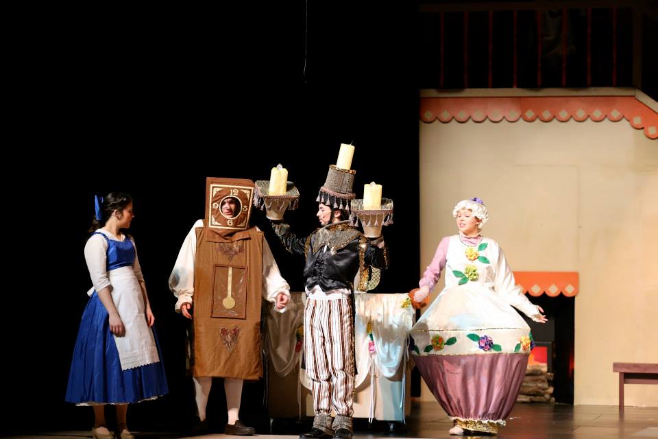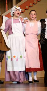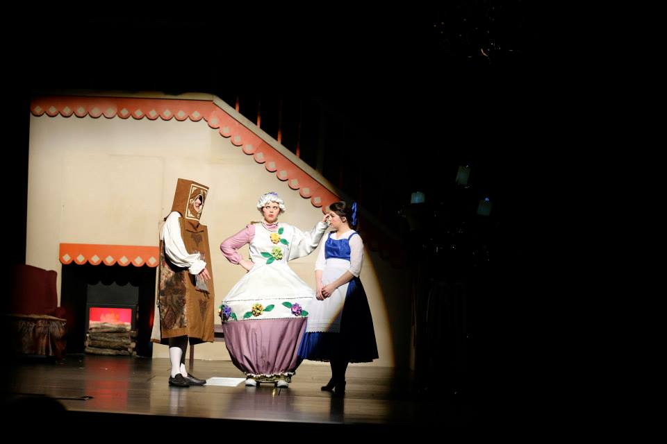 The flower embellishments are over-sized, bright in color and 3-dimensional. They may seem a bit “much” up close . . but from the back of the auditorium, they are visible, which was part of the goal. The bright colors are also in contrast to the muted tones that we chose to dress the villagers/chorus in. This adds to the “Enchanted” effect.