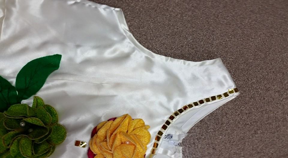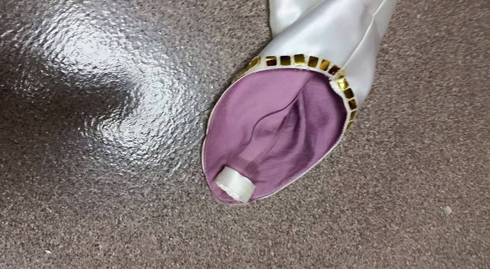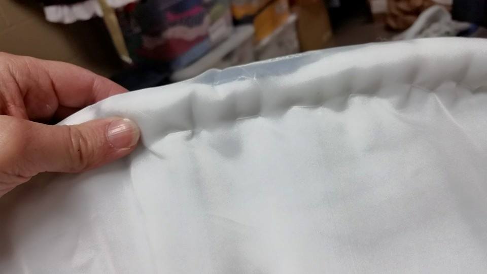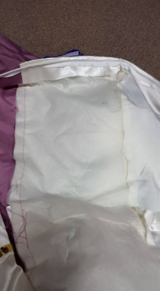 Once that was done, our costumer decided to have a straight band for placing the “china” decoration. This was a long rectangular strip of fabric that was sewn to the edge of the circle. This follows the shape of the hoop (with the two like sized hula hoops suspended one above the other). The width of the strip should match the distance the hula hoops are apart. This is a picture of the strip (white). The strip is backed with interfacing to give it stability and help keep it from stretching.