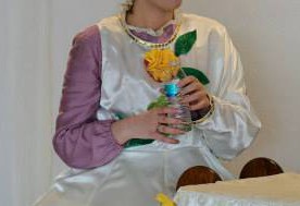 One of the very important parts of the Mrs. Potts costume is the posture of the actress. Elevating the spout arm whenever possible in an integral component to creating the image of the teapot.