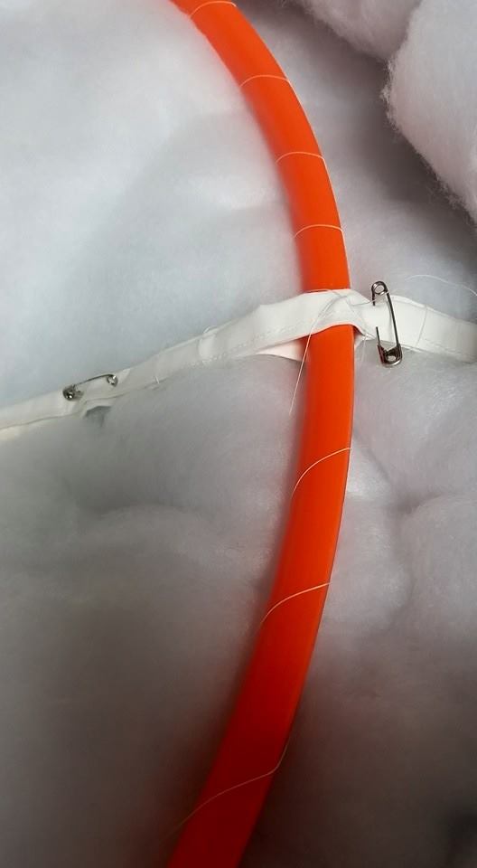 We used 3 hula hoops. One smaller (orange) at the top to give a rounded shape, and then a larger one below (yellow), with a second larger on suspended directly below the first (encased in the fabric).