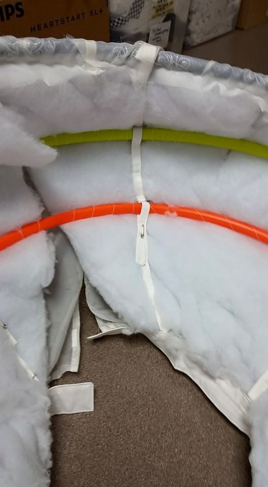 The supplies that were used were the 3 hula hoops (in two sizes), an old white sheet, quilt batting & a batting Christmas tree skirt, twill tape, pins, hook & loop tape, and a slippery shear curtain (thrift store).