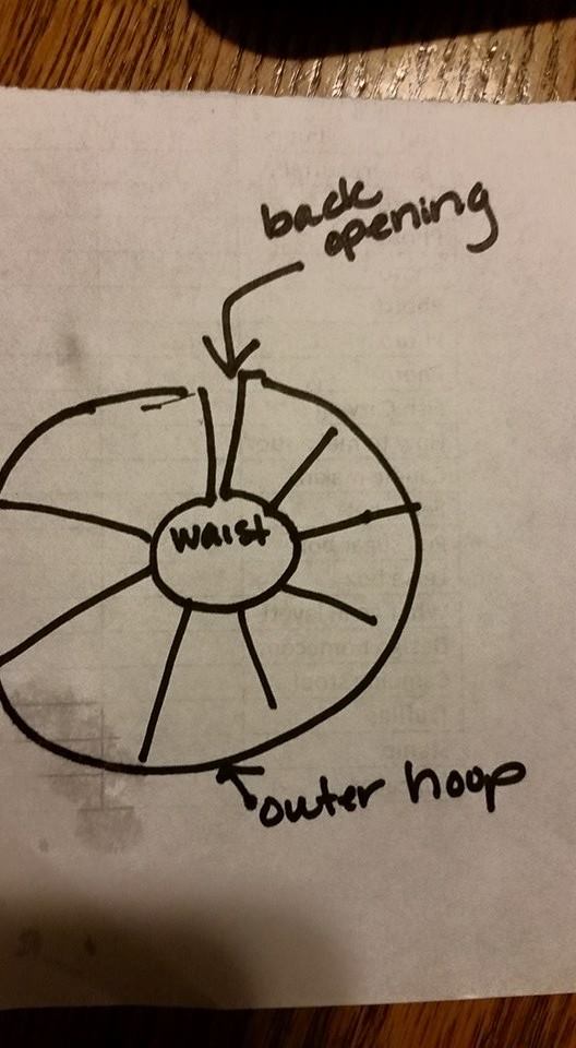 The skirt required a little bit of math and a few drafts to make a pattern for the wedge-shaped pieces that make the top. To do this, you need the desired waist measurement (circumference) and the circumference of the outside edge of the hoop, plus the distance between those two circles (adding a bit of extra distance to go over the curve of the smaller hoop and the poof of the padding. This is a really rough drawing of a top view of the top of the skirt (excuse the water drops on my paper!) Don’t forget you need an opening in the back to get the dress on and off. If you are at all uncertain about your drafted pattern piece . . make a sample top out of some junk fabric. It will be well worth the time and effort if it saves your fashion fabric.