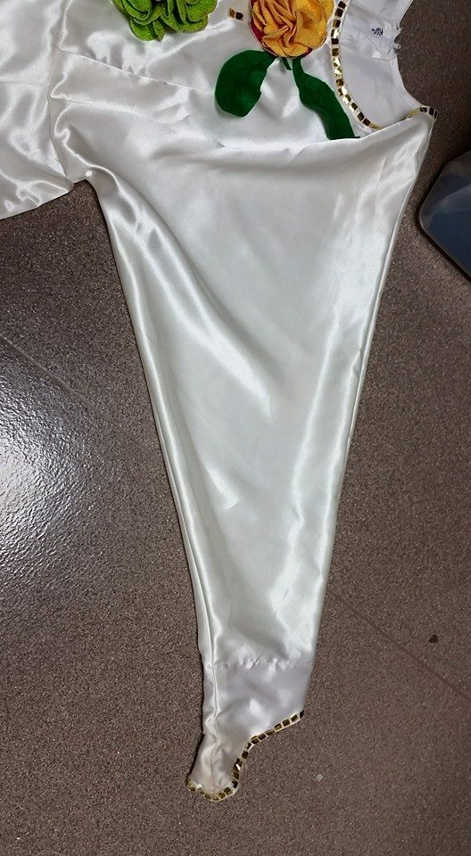 For the dinner “theme” for the “Be Our Guest” scene I opted to go with a white & gold look. I purchased a roll of off-white bridal satin from Fashion Fabrics Club (https://www.fashionfabricsclub.com/c1313_fabric-by-the-bolt-wholesale-fabric-bridal-satin-by-the-bolt). This is really nice fabric. The price is reasonable (just over $4/yard and 60″ wide), it has a nice weight, and it washes well. Our 18 yard bolt had enough to make Mrs. Potts, the 5 Plate costumes, the 5 napkin dresses, and the tablecloth for the Chip cart. I also purchased a bolt of the “Gold Square Sequin” fabric to use for trim. This fabric was used for the Be Our Guest aprons, bow ties & cummberbunds, trim on the napkin dresses, trim on the plates, parts of the Chip costume, and trim on Mrs. Potts. This is not my favorite fabric. The gold squares come off VERY easily. We used fabric glue to re-glue them to the Mrs. Potts costume during the show. They have continued to shed. While I love the way the fabric looks onstage . . I would not use it again. While this post is not about the “Be Our Guest” scene, since Mrs. Potts and Chip are a part of the dining room set, I wanted them to coordinate with this scene, as well as with each other.