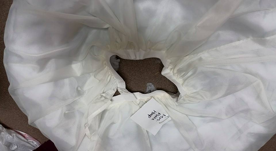Once the basic form was made, the cast member tried on the hoop on to check for height and placement. Then, the batting was draped over the hoops and the hoop was basted to the batting to keep it in place. The batting was also basted to the waistband by hand. To keep the costume from “sticking” to the batting, a sheer curtain was used to make a “topper” for the hoop.