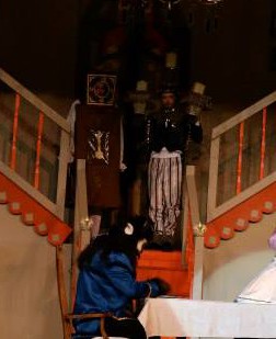 The inspiration for the costume itself came from the Broadway costume. I liked the vertical lines . . the stripes on the pants, and the lines down the sides of the jacket and sleeves that give the suggestion of a candelabra when the cast member holds his/her arms up. I did not actually construct this part of the costume . . . another of my fabulous volunteers did this creative work.
