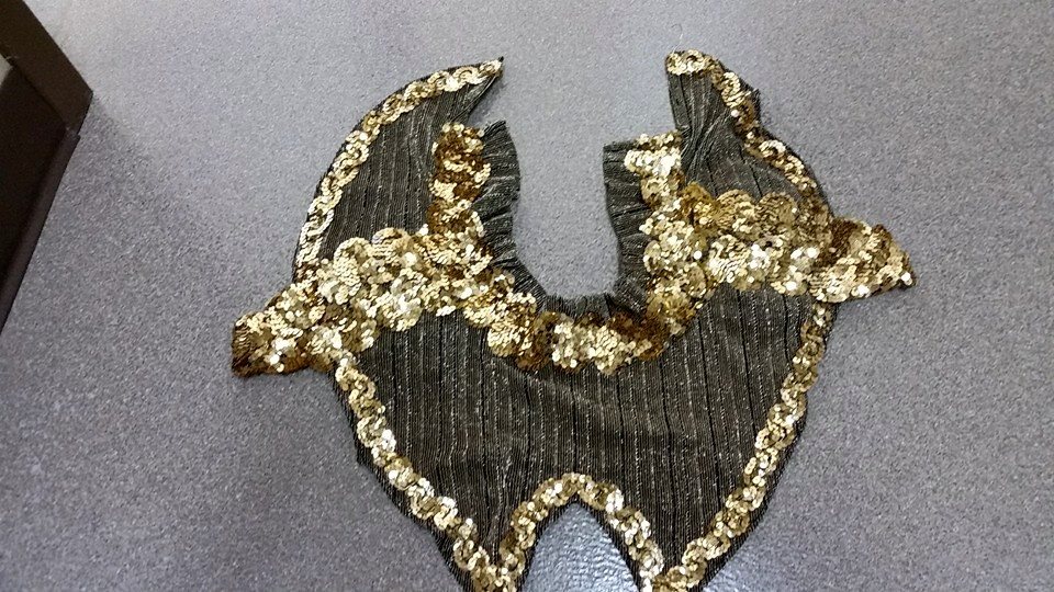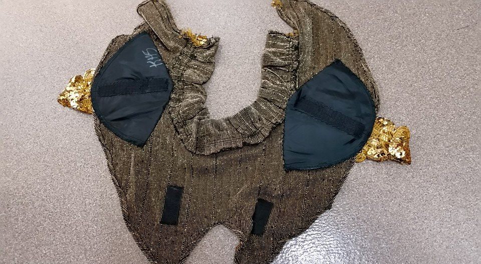 The collar secures to the shoulders with hook & loop tape. This same fabric was used to make wrist covers and ankle covers. The fabric was sewn to black gloves and extended down to cover the sleeve opening of the jacket. This fabric was also used to cover the hat. The fabric came from two matching glittery gold long-sleeved shirts from a thrift store. What is very interesting about these shirts is that up close, and from across a room (15-20′), they glitter very nicely. On stage . . not so much.
