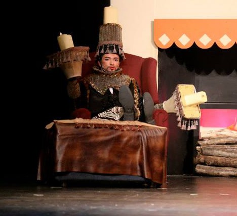 We had a piece of striped upholstery fabric donated, and so this easily became a pair of pull on pants. The costumer added gold trim down the sides of the legs.