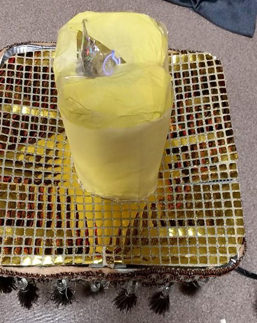 I had made a “cover” for the lampshade that fit around the juice bottle out of plastic mesh covered with fabric and some velcro to hold it in place. I covered this in gold fabric that matched the Be Our Guest costumes & the Mrs. Potts trim.