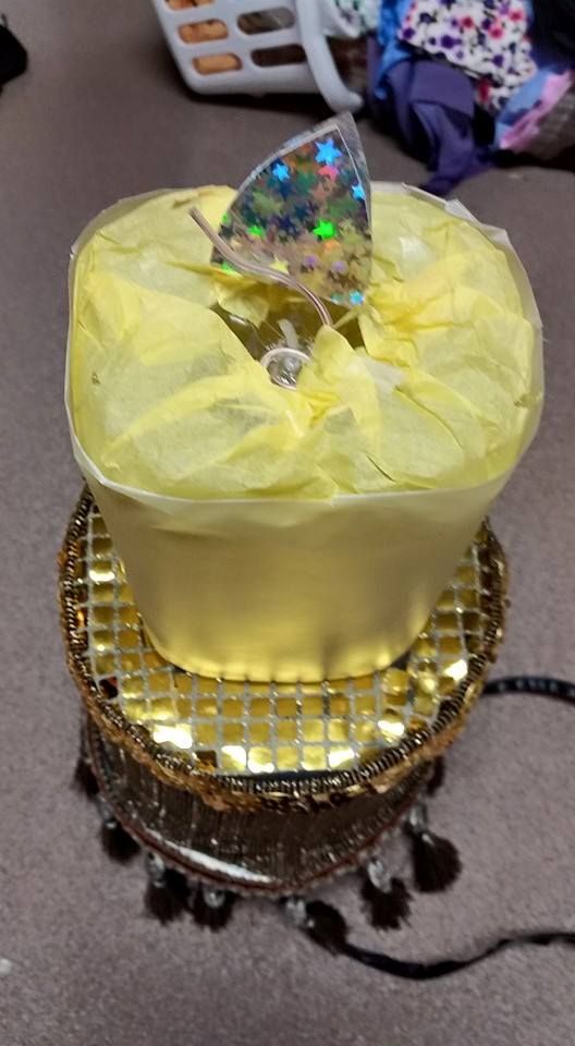 At this point, I had my lamp shades (upside down). I had decided to use an empty clear plastic 2 qt juice bottle for the “candle”, so those were attached. I had covered these with parchment scrapbook paper.