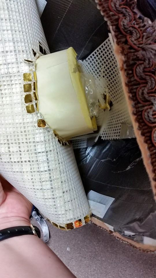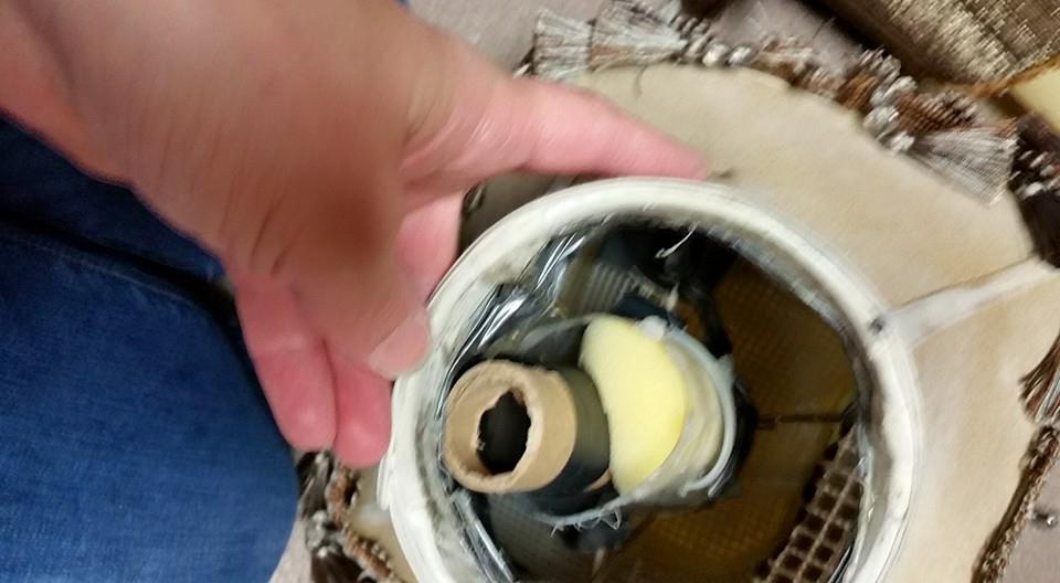 The hand pieces . . eventually my daughter finished them. She found some thin plastic bottles and cut “windows” in them and filled them with stuffing and a cardboard tube to support the on/off boxes. The bottoms were cut off and then taped in place so that theoretically you could pull the boxes out to change the batteries. The bottles were zip-tied to the wire lampshade frames.