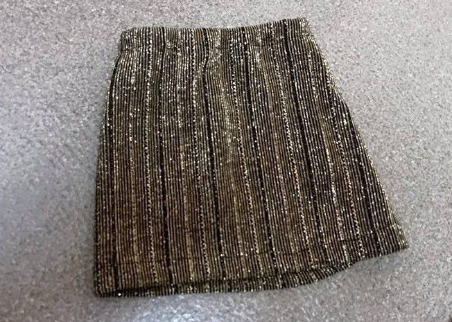 The jacket is made of black satin. It has gold sequin trim on the sleeves. The cast member and costumer added “cords” with more hanging gold trim.