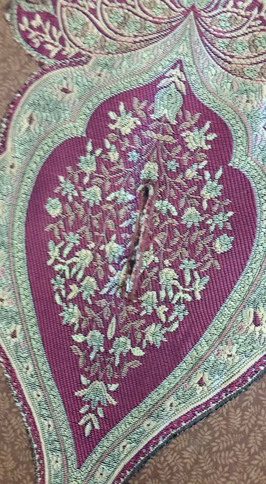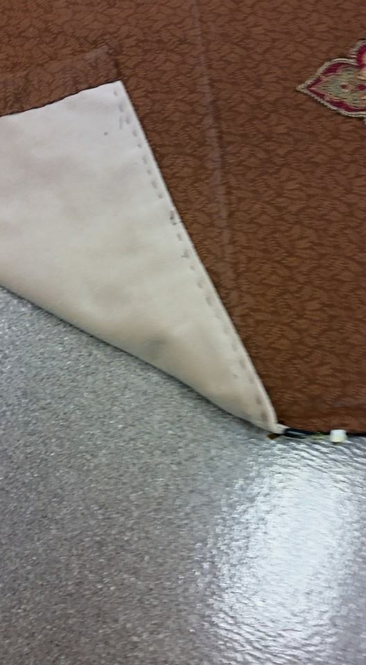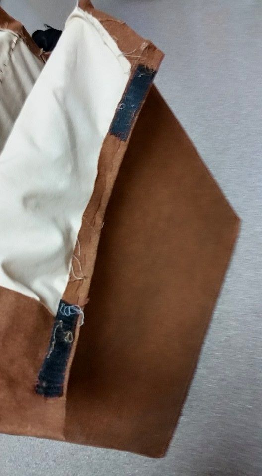 Much of the finish work on this costume had to be done by hand due to the boards in the costume. This picture shows the back piece. The thin board stops at the line of stitching, and the bottom part is a soft flap. How this construction feature came about is kind of a funny story. The costumer and cast member had multiple fittings together, and all seemed to be in good shape. The cast member was wearing his costume for one of his first “trial runs” just to make sure things would work . . and all was going well . . until . . .he tried to go up the stairs.