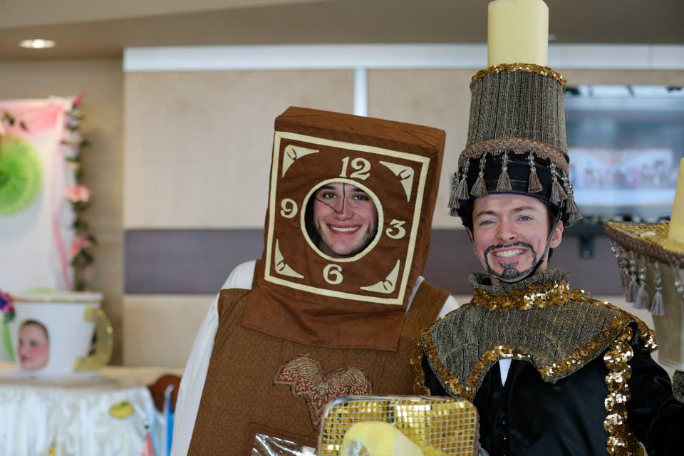 The transformation to Human Again involved removing his outer clock costume and headpiece, removing the clock makeup, and adding a brown tunic (made from the same fabric as the main clock).
