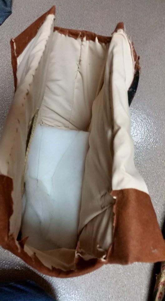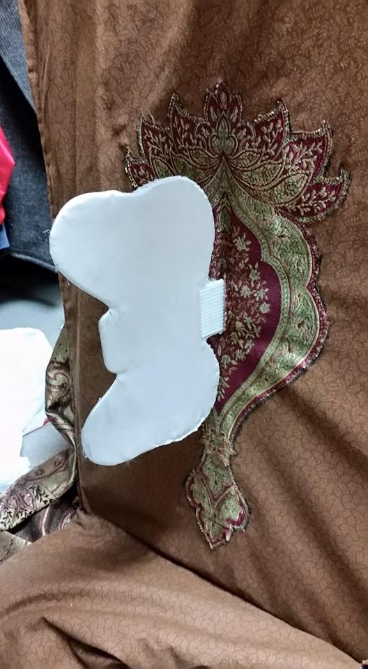 The “frame” of the headpiece is constructed out of plastic canvas. It is lined, and there is additional batting added in the top to adjust the height to the actors face, as well as make it a bit more comfortable.