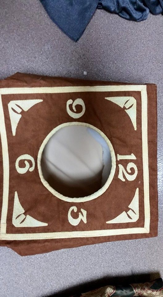 If I were going to redesign this costume, I would consider making the clock face an oval, instead of a circle. Then, the headpiece could be adjusted so that it sat back just a bit more on his shoulders so that his face was a bit more visible. That said, his face was never really hidden, and he was able to move and sing without impediment. Another option would be to make the circle a bit larger. We also could possible have added an elastic or knit strap/headband of some sort that would wrap around the back of the head and hold the headpiece closer to his face. These are just ideas for possible tweaking if anyone is trying to decide how to make one.