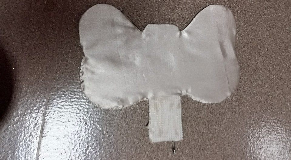 The headpiece attaches to the front and back of the costume with flaps, which are attached with hook & loop tape.