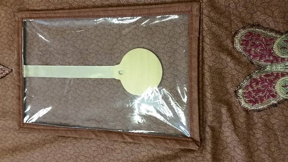 The key on the back was made out of several layers of plastic canvas covered with silver fabric. There is extra plastic canvas glued to the outside as rehearsal proved that the piece needed some extra stability.