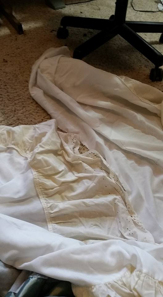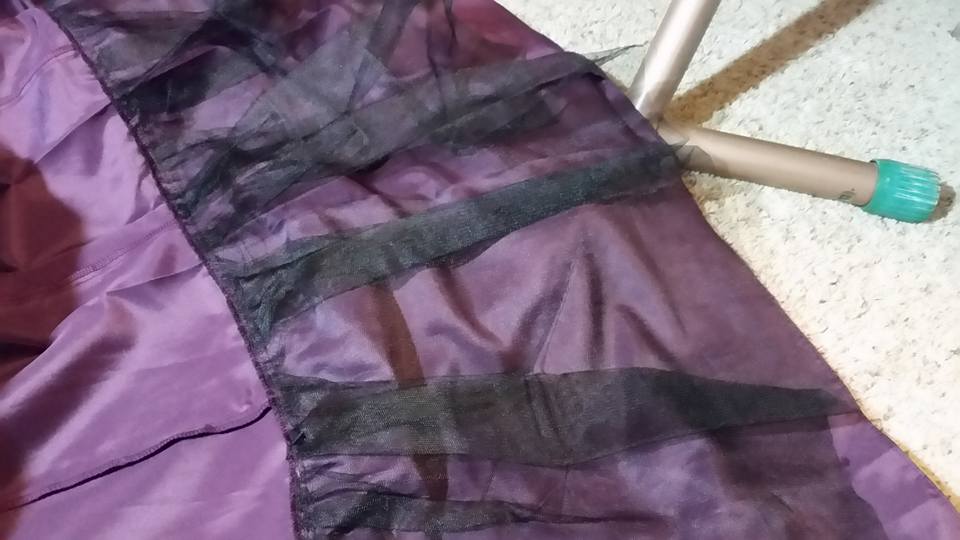 Cost: Eggplant bridesmaid dress $3, pillow sham $1.88, valance, $1.88, bedskirt $2, plus a little elastic & thread. Poofy petticoat, $6.99
