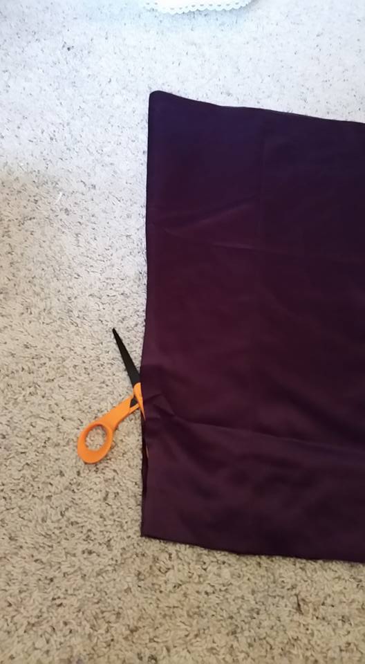 The first thing that I did was to cut the fabric out from behind the pleat. I carefully cut, making sure NOT to cut the outside dress. I used a pinking shears so that I would not need to worry about fraying along the rough edges.
