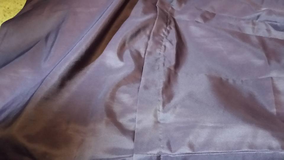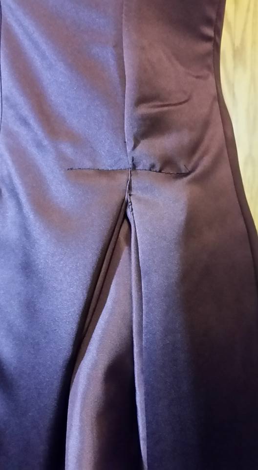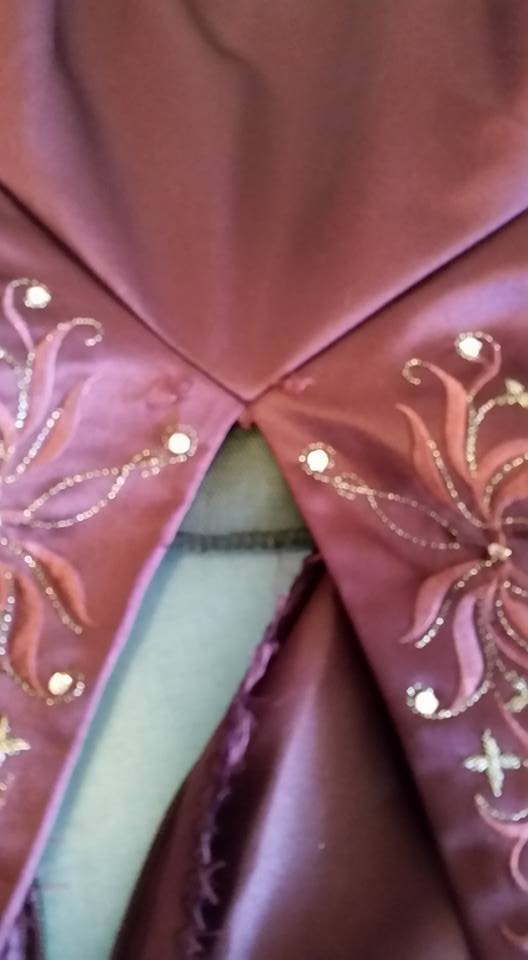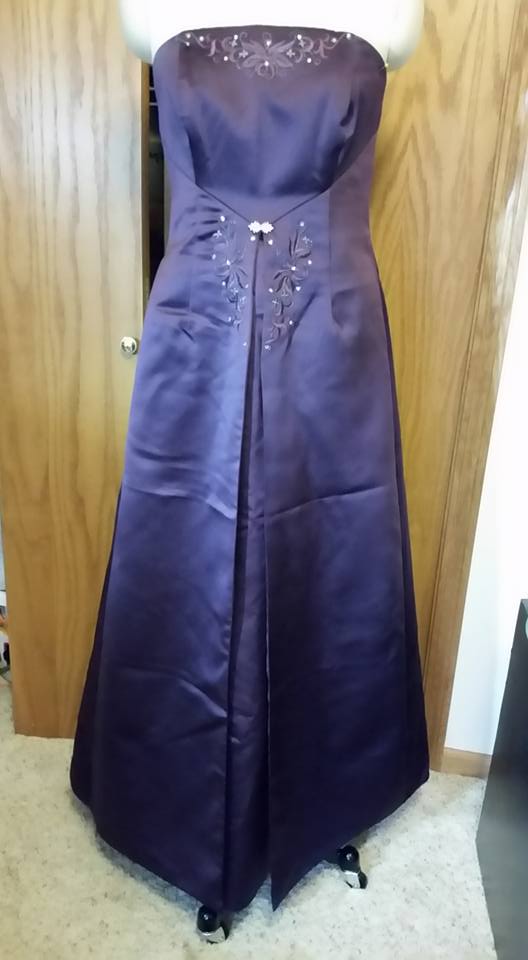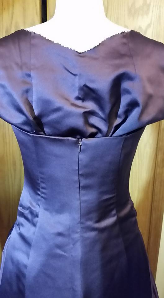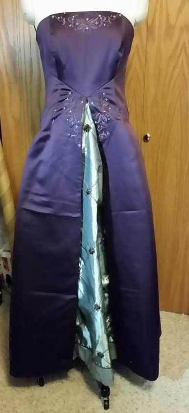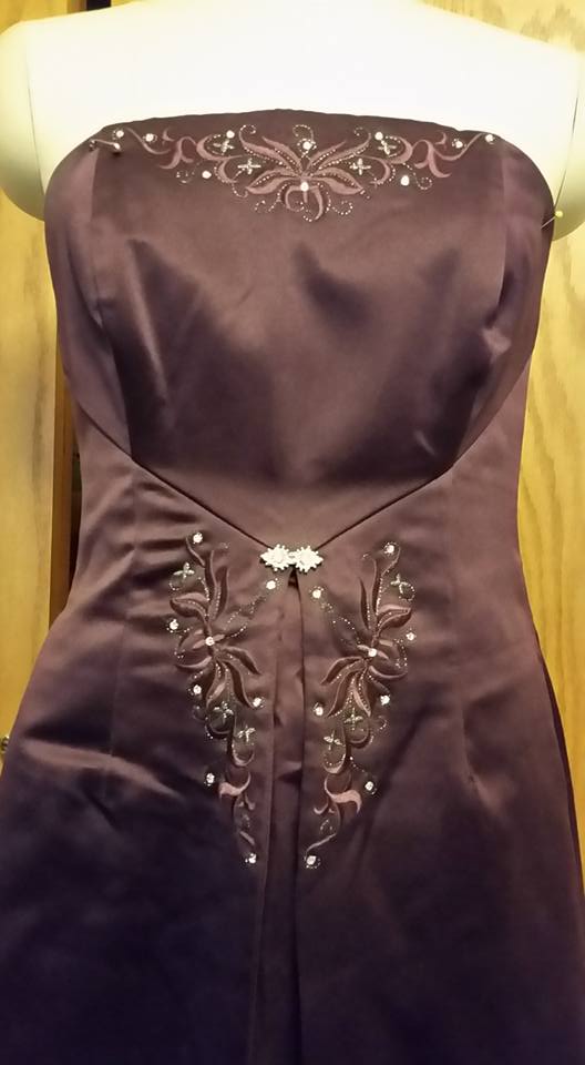 To begin with I started with an eggplant colored strapless bridesmaid-type dress. The dress had decorative embroidery and jewels at the bodice top, and at the waist. It also had a deep inverted pleat at the center front. The dress was fully lined with matching eggplant fabric. The center point actually sits slightly above the natural waist . . . a design feature that later on affected the upcycle.