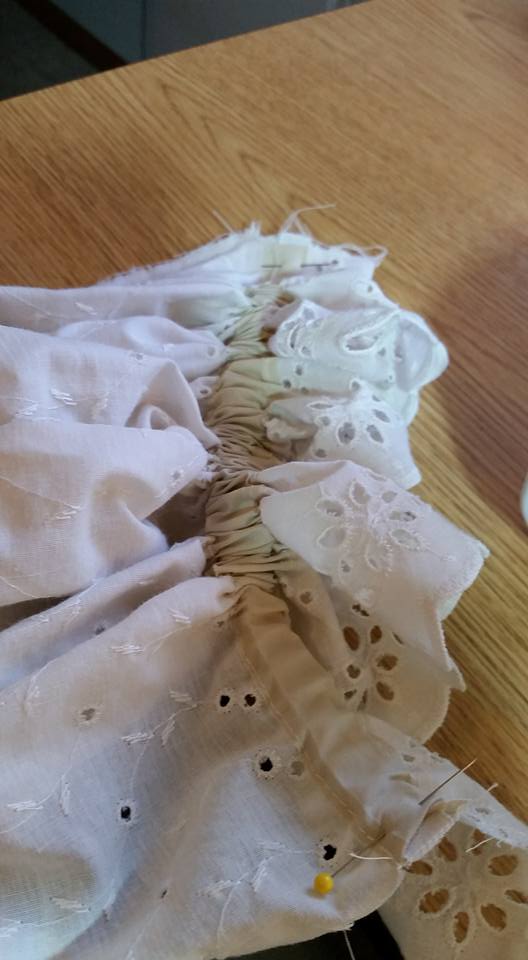 For the “chemise” sleeves, I cut pieces of the eyelet bedskirt. I held the fabric up to my arm to figure out length. I then used a piece of bias tape to make a casing at the wrist.
