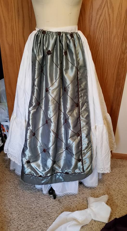 This is what the completed dress looks like! Overdress, sleeves, & petticoat, wearing an additional poofy petticoat underneath, and a coordinating hat.
