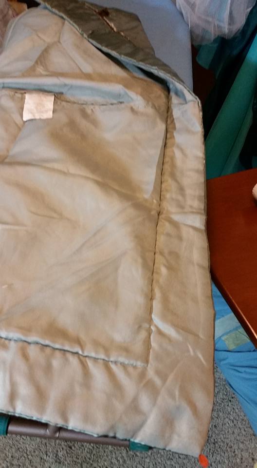 The first thing I did was to remove the back lining from the pillow sham. This actually provided a disappointingly small quantity of fabric. It also exposed the padded backing of the pillow sham, which later on proved to be a nuisance as it wanted to catch and shred. There certainly was not enough fabric to make sleeves, and I would not consider this to be a source of fabric (other than maybe for trim) in the future.