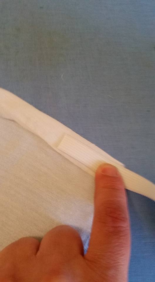Next, I ran some elastic through the casing. To do this, I attached a pin to one end and threaded it through, being careful not to pull the end into the casing. I pinned the elastic to keep it in place.