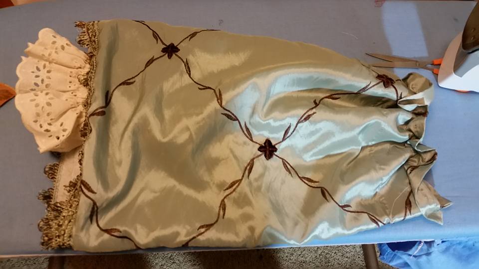 I wanted the dress to have a contrasting underskirt and this seemed like the perfect time to try out another idea I have been playing around with in my head. I LOVE pillow shams. Especially KING SIZE pillow shams, that are often padded/quilted and high decorated . . . and tend to be around $2 at the thrift store. I have been thinking that they are just big enough for the front of an underskirt (or maybe the front of a tunic for Page or Knight?).