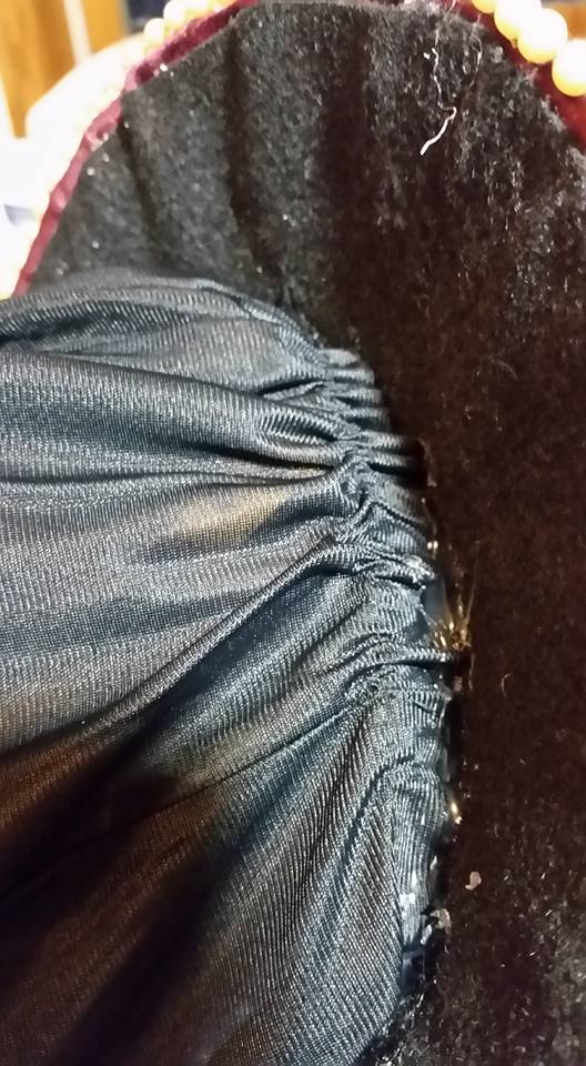 The last thing I did was glue a piece of velvet ribbon to the inside of the headband part. Velvet ribbon is AMAZING at keeping headbands from slipping. I planned to add ribbon ties to the hat (or you could use hairpins), but I figured the velvet would help keep it in place. (If you are making a really nice hood, most tutorials have you sew heavy gauge wire to the edges to help shape it and hold it in place. For my purposes, ribbon ties would work just as well).