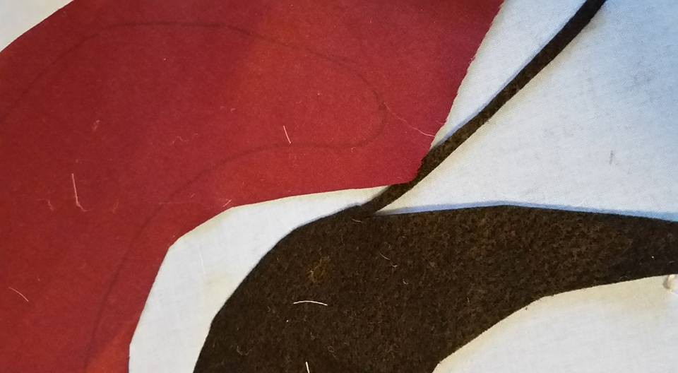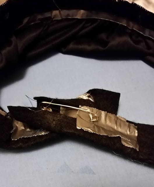I needed to make the band that goes on the head, which is called the “paste”. This can be various shapes. I liked the version that goes over the head, and then wraps around the back of the head to help hold it in place. It looks like two “L” shapes attached together at the top. Once it is made, you adjust the fit, and sew/pin/close the tabs at the back of the head.
