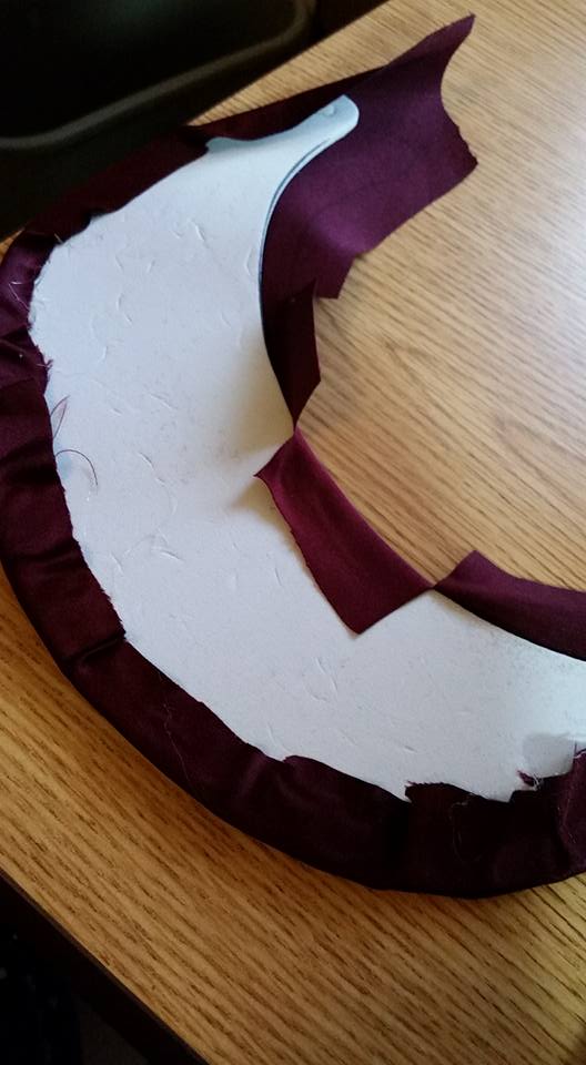 Next, I secured the fashion fabric to the visor with one dot of hot glue. Then I folded the fashion fabric around the visor and tacked it down with hot glue. I clipped the fabric as needed to go around the curves.