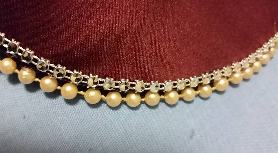 The next step was to decorate the visor piece. I chose to hot glue an old pearl necklace to the very edge. Hot glue CAN show when it dries. Depending on the glue sticks (clear or cloudy) the color can vary. It is easy to get too much glue and have it be sloppy looking. “Threads” of hot glue can easily be cleaned up by running a blow dryer over it after the project is complete. Try to use as little glue as possible, and glue short distances at a time so that the glue stays hot. Hot glue works best in areas that will not be subject to stretching.